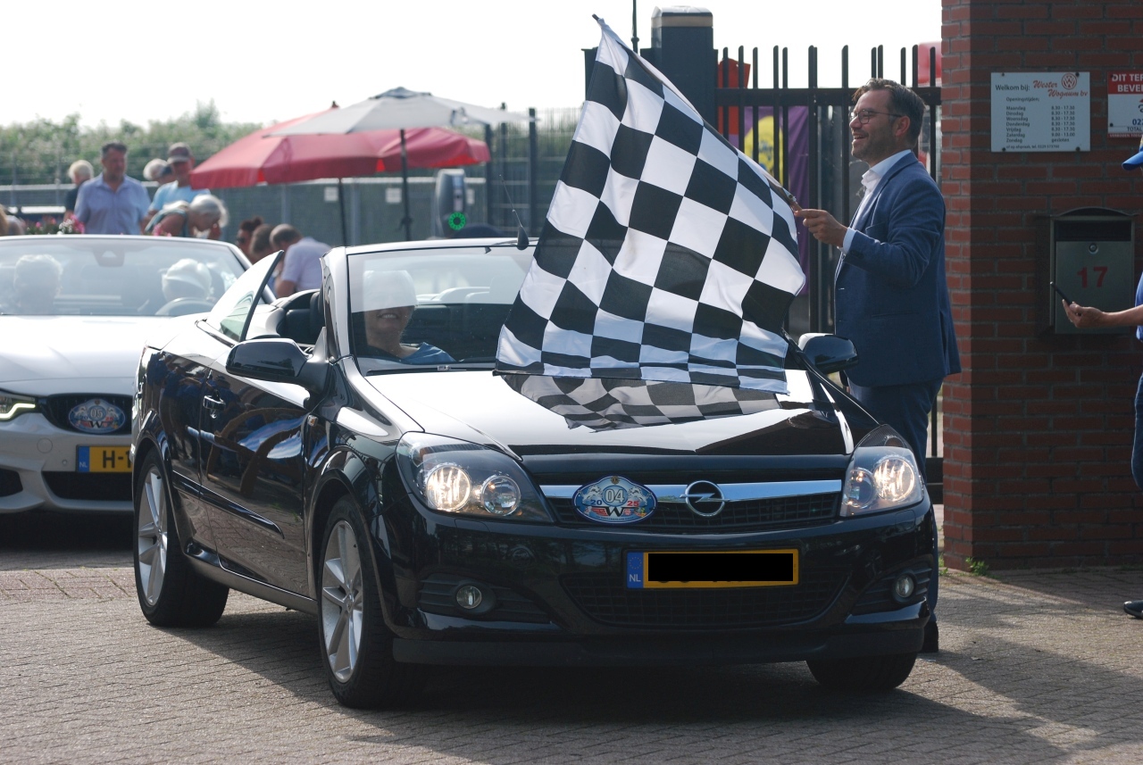 Onder een mooi zonnetje vlagde burgemeester Michiel Pijl de deelnemers aan de 12e Lions West-Friesland Rally op weg. Op de foto rechts stuurt hij met